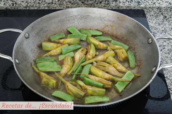 - Echa las alcachofas junto con las alubias verdes en la paella y un poco de sal y cocínalas a fuego medio hasta que se doren un poco. Ve dándoles la vuelta de vez en cuando.