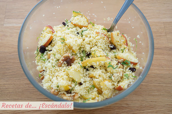 - Pon el cuscús en un bol y añade también las manzanas, las pasas, las nueces y la hierbabuena picada con el cuchillo, reservando un trocito para la decoración final. Mézclalo todo bien.  Mezclamos los ingredientes con el cuscús
