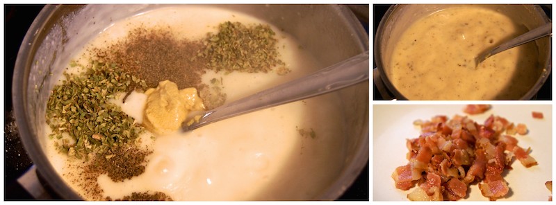 Preparación de la salsa bechamel de mostaza, y el bacon