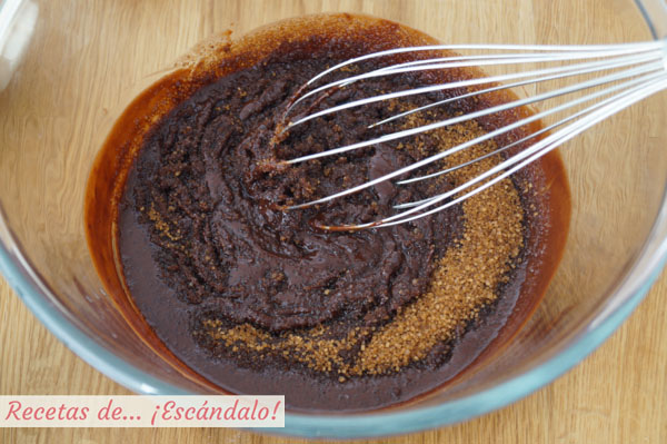 - En el bol del chocolate y la mantequilla derretidos echa el azúcar moreno y mezcla un poco con las varillas.