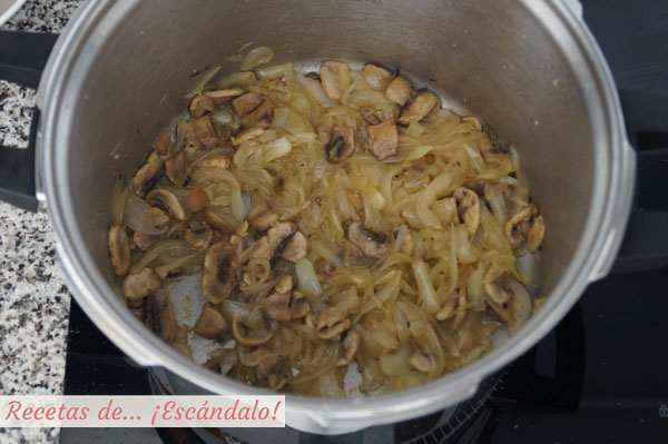 - Cuando la cebolla esté tierna incorpora los champiñones y cocínalo todo junto 5 minutos más, removiendo de vez en cuando.