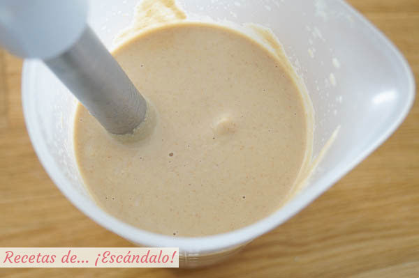 - Tritura la salsa con una batidora de mano, de vaso o un robot hasta que esté fina y con la textura que más te guste. Yo a veces le he tenido que añadir más caldo para que quedase menos densa, pero esto ya va en gustos. Lo ideal es que esté algo líquida ya que después vamos a seguir cocinándola con las albóndigas.